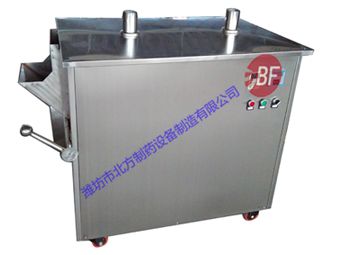 滾筒式炒藥機 由炒藥滾筒、動力系統及熱源等部件組成,有的還附有加料裝置的出料裝置,見圖2-6所示。操作時,將藥材通過筒口加入,蓋如筒蓋板(為了散熱常在蓋板上留有散熱孔)。加熱后,開動滾筒,借動力裝置滾筒做順時針方向轉動。使筒壁均勻受熱。當藥材炒到規定程度時,打開蓋板,按動是鈕,使滾筒反向旋轉,即可使藥材由出料口傾出。滾筒式炒藥機的熱源可用爐火,也可用電爐可煤氣。
