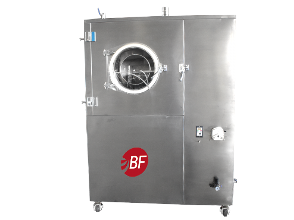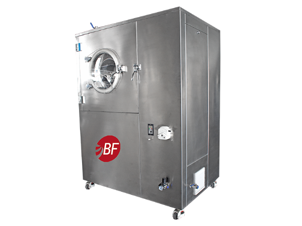 BG系列包衣機是將被包衣的片芯在包衣機的滾筒內通過可編程序控制系統的控制,使之不斷的、連續的、重復地做出復雜的軌跡運動,在運動過程中,由控制系統進行可編程序控制,按工藝順序及參數要求,將介質經自動地以霧狀噴灑在片芯的表面,同時由熱風柜提供經10萬級過濾的潔凈熱空氣,穿透片芯空隙層,片芯表面已噴灑的介質和熱空氣充分接觸并逐步干燥,廢氣由滾筒底部經風道由排風機經除塵后排放,從而使片芯形成堅固、光滑的表面薄膜。