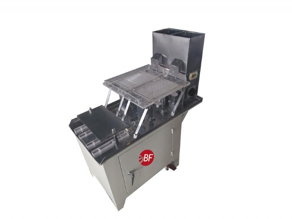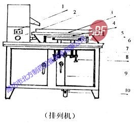 5、活動板下面有兩根橫著的模板托條,是B機的放B模板,是A機的放A模板,位置放在活動板下面,托條上面即可。當排列板上膠丸全部排滿時,只要將模板推入即可,這時在排列板上的187粒膠丸全部落入模板之中(若有落得不干凈,可以推入時往復多推一次,動作要快),這時可踩一下踏腳板,然后將模板取出。A機.B機使用方法相同。